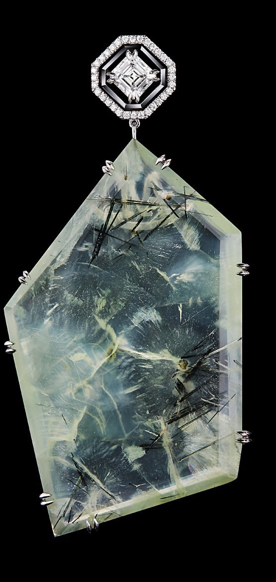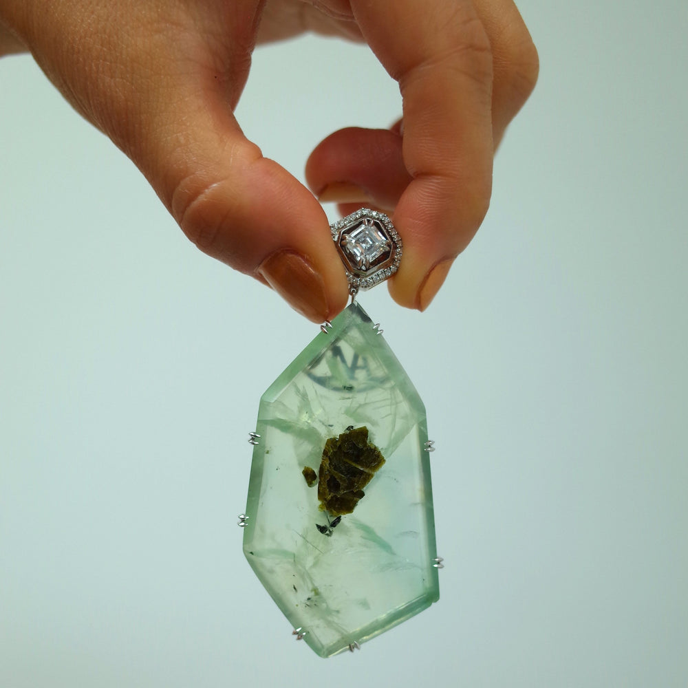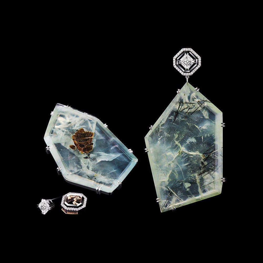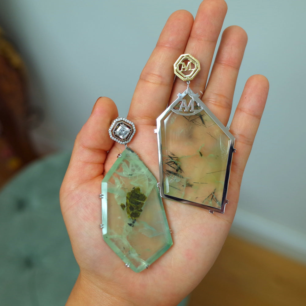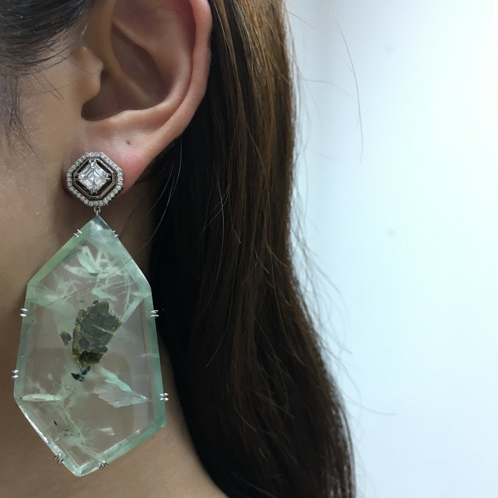A pair of one-of-a-kind earrings featuring Asscher-cut Diamonds and Prehnite Precious Stones.