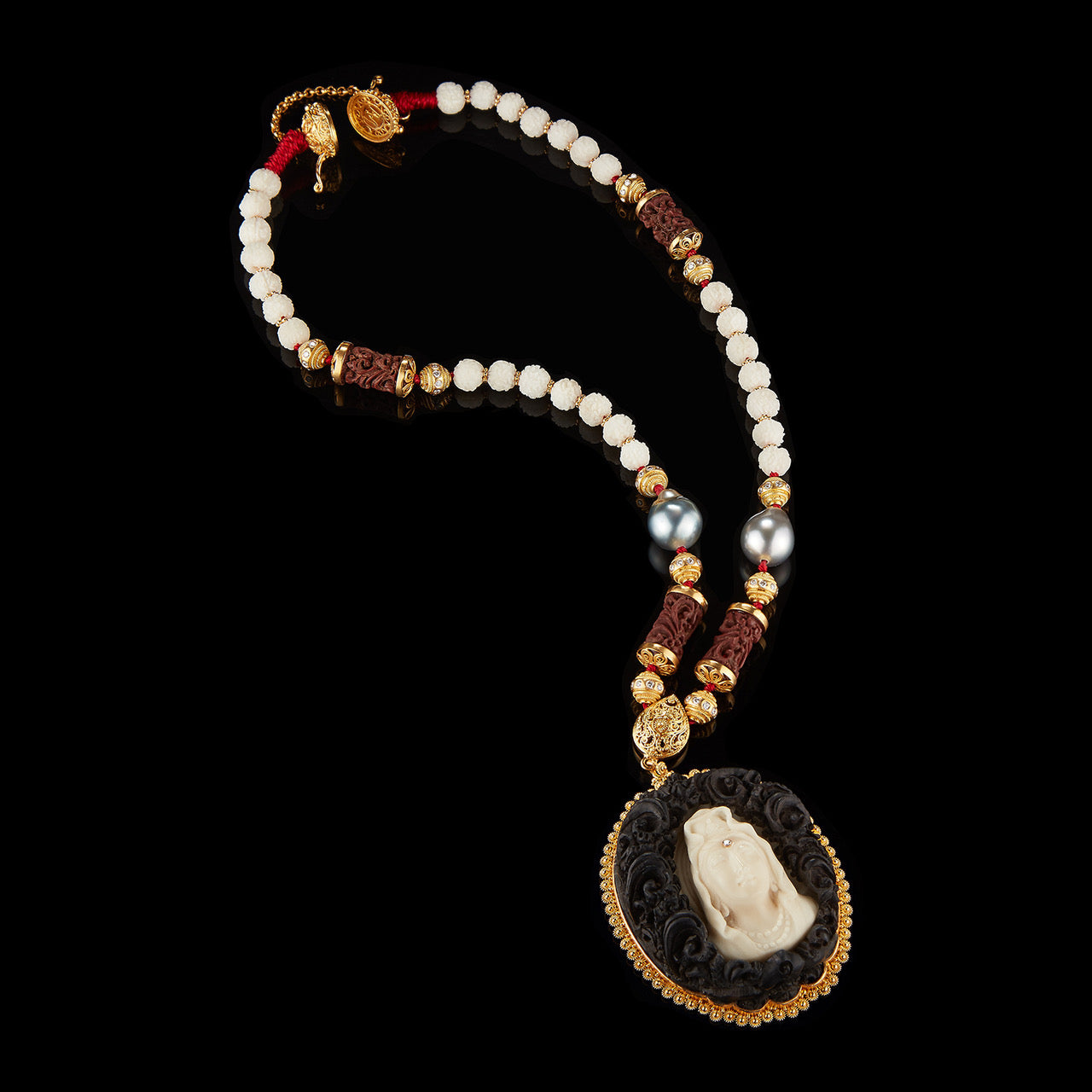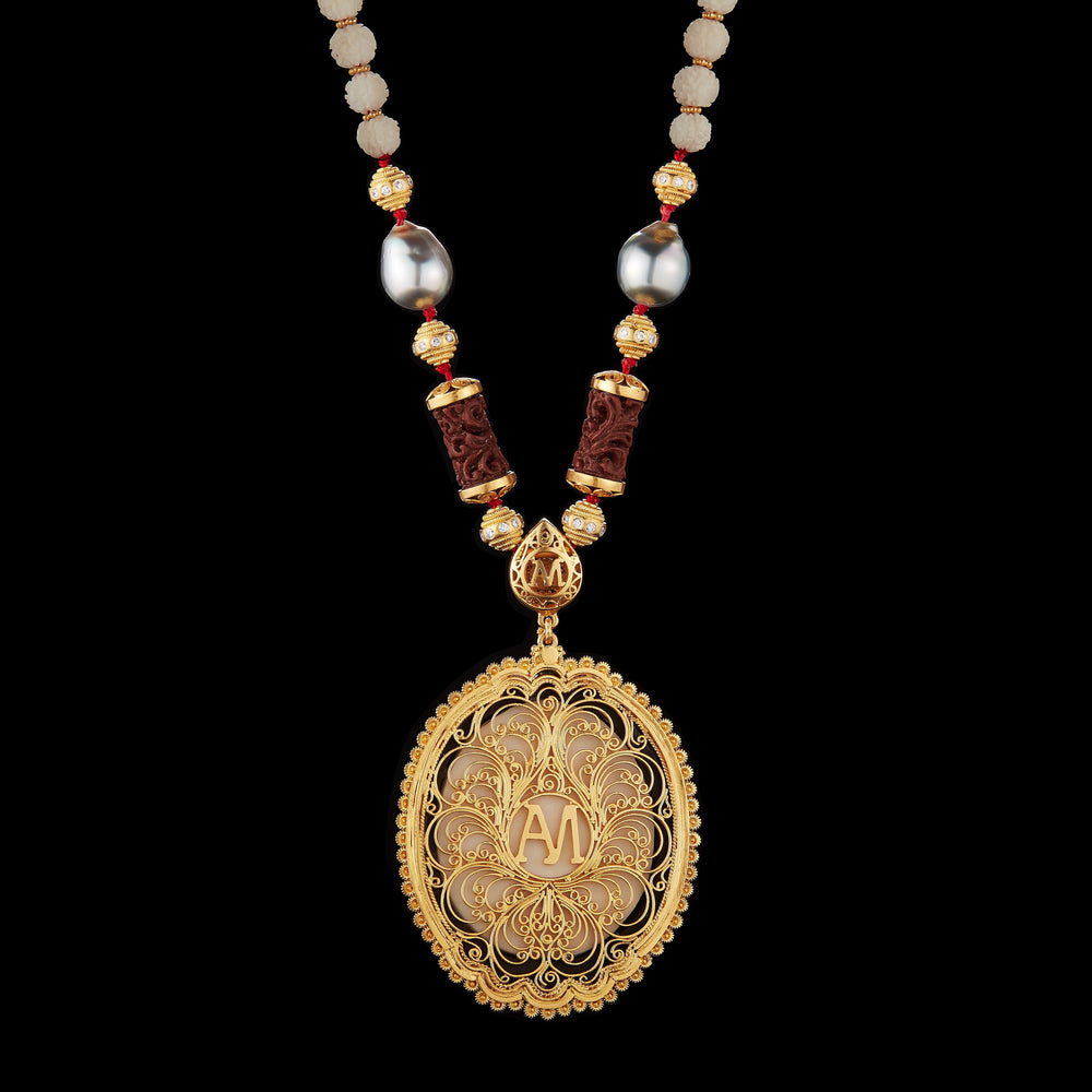 The necklace strand features 7mm carved Tagua seed Rudraksha beads, long, carved Sawo wood beads and Mabe pearls with golden flower circle dividers. Clasp is set in an Alexandra Mor 22 karat yellow gold logo gallery adorned with traditional handmade yellow gold filigree.