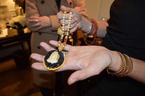 Tagua Seed carved like Rudrakshas beads, primarily used in India and Nepal as beads for malas, are valued similar to semi-precious stones. Guānyīn is a translation from the Sanskrit Avalokitasvara or Avalokiteśvara, referring to the Mahāyāna Bodhisattva, or the Goddess of Mercy. Found in temples all over Bali, the Padmasana, or lotus flower is a representation of the cosmos and symbolizes purity of the body, speech, and mind. Rooted in the mud with beautiful and serene flowers that float atop the water’s surface, the lotus form is symbolic of the individual’s attachment and desire while the drops of water that slip easily from its petals are a reminder of detachment.