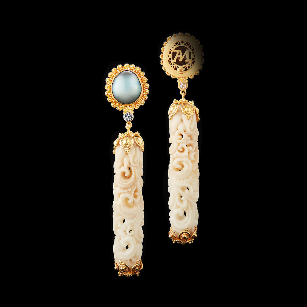 This pair of long dangling earrings feature carved wild-harvested Tagua Rudrakshas complimented by two 10.9mm Mabe pearls and .22 carats of Brilliant-cut Diamonds. Prolific carvings in 22 karat yellow gold are inspired by the symbolic practices and techniques in ancient Balinese gold work, where design motifs feature vines, leaves and tendrils that entwine temples while mythical creatures peer out from moss-covered walls. Found in temples all over Bali, the Padmasana, or lotus flower is a representation of the cosmos and symbolizes purity of the body, speech, and mind. Rooted in the mud with beautiful and serene flowers that float atop the water’s surface, the lotus form is symbolic of the individual’s attachment and desire while the drops of water that slip easily from its petals are a reminder of detachment.
